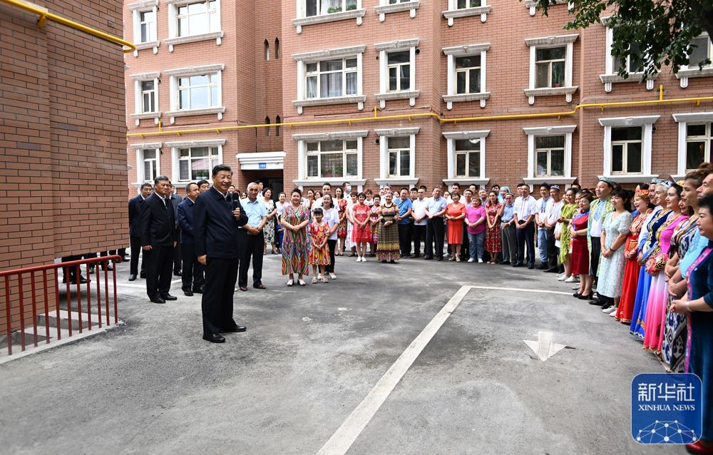 7月12日至15日,中共中央总书记、国家主席、中央军委主席习近平在新疆考察。这是13日上午,习近平在乌鲁木齐市天山区固原巷社区考察时,同各族群众在一起。新华社记者 谢环驰 摄